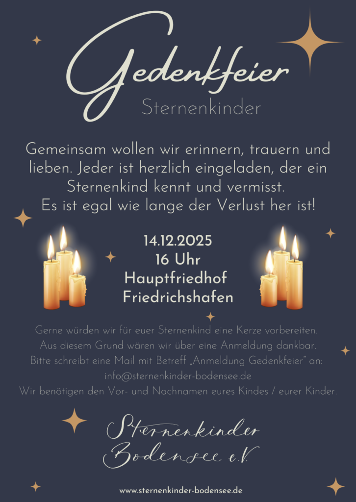 Gedenkfeier 2025 Gemeinsam wollen wir erinnern, trauern und lieben. Jeder ist herzlich eingeladen, der ein Sternenkind kennt und vermisst. Es ist egal wie lange der Verlust her ist! 14.12.2025 16 Uhr Hauptfriedhof…