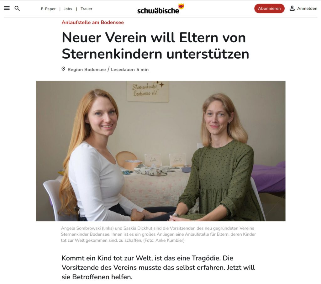 Die Schwäbische Zeitung hat einen großen Bericht über die Tätigkeiten unseres Vereins veröffentlicht. Dieser kann kostenfrei unter dem Link eingesehen werden. https://www.schwaebische.de/regional/bodensee/friedrichshafen/hilfe-fuer-eltern-von-sternenkindern-neuer-verein-fuer-die-bodenseeregion-gegruendet-1407765