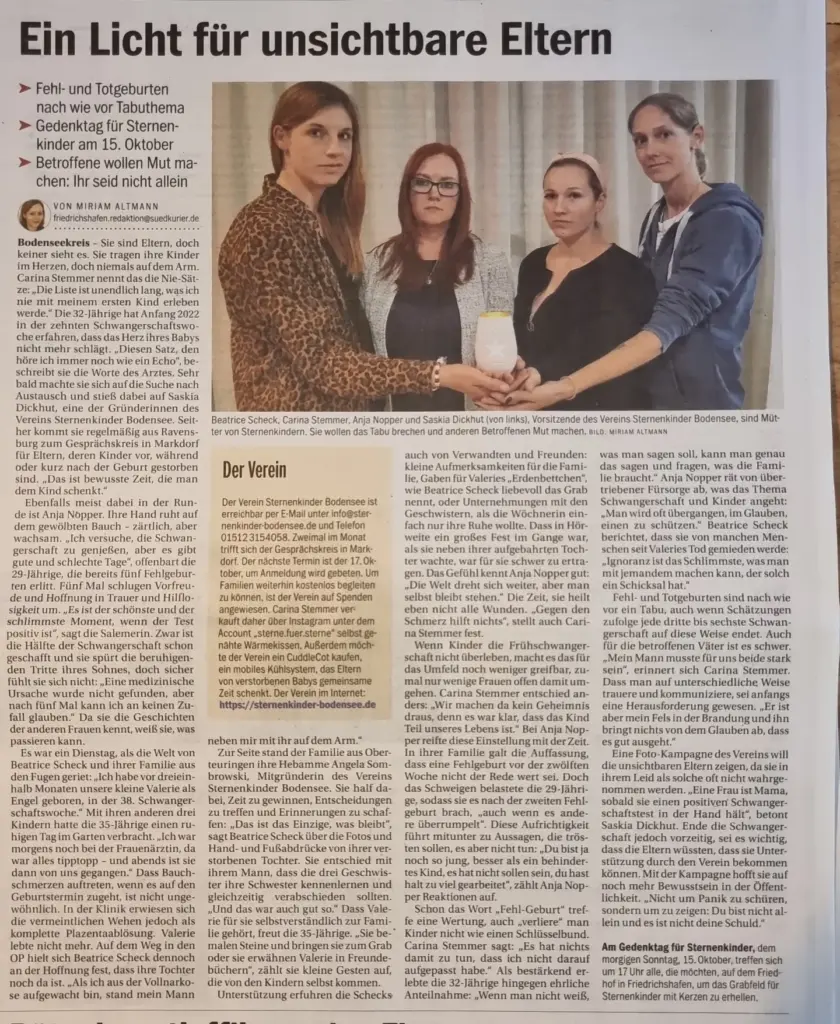 Der Südkurier hat einen großen Bericht über die Tätigkeiten unseres Vereins veröffentlicht. Dieser kann unter dem Link eingesehen werden: Bodenseekreis: Trauer kennt keine Größe: Wie der Verein Sternenkinder betroffene Eltern unterstützen möchte…
